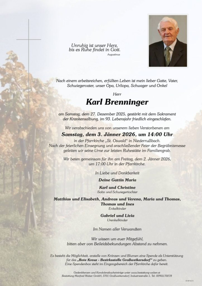 Tief betroffen geben wir Meldung über das Ableben unseres Feuerwehrkameraden Karl Brenninger.